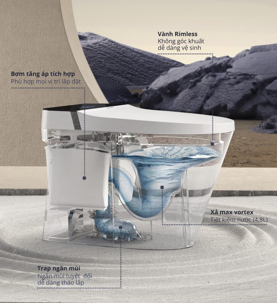 Ag+ Ceramic, Bảng điều khiển tiện lợi, Chế độ rửa phía sau, Chế độ vệ sinh cho phụ nữ, Chuẩn chống nước IPX4, Công nghệ xả Max Vortex, Làm ấm nắp ngồi, Nắp bàn cầu tự động đóng mở, Nắp bồn cầu đóng êm, Nắp ngồi sử dụng điện, Rimless, Sấy khô tự động, Tiết kiệm nước, Trap nhựa đứng thoát sàn, Vòi rửa vệ sinh thông minh