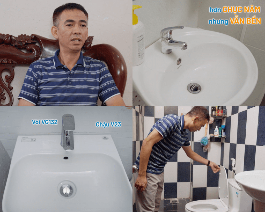 Dù đã sử dụng trong một thời gian rất dài, sản phẩm bàn cầu, chậu rửa và vòi nước tại gia đình anh Tọa vẫn đảm bảo vận hành tốt các chức năng với lớp men sáng, đẹp.