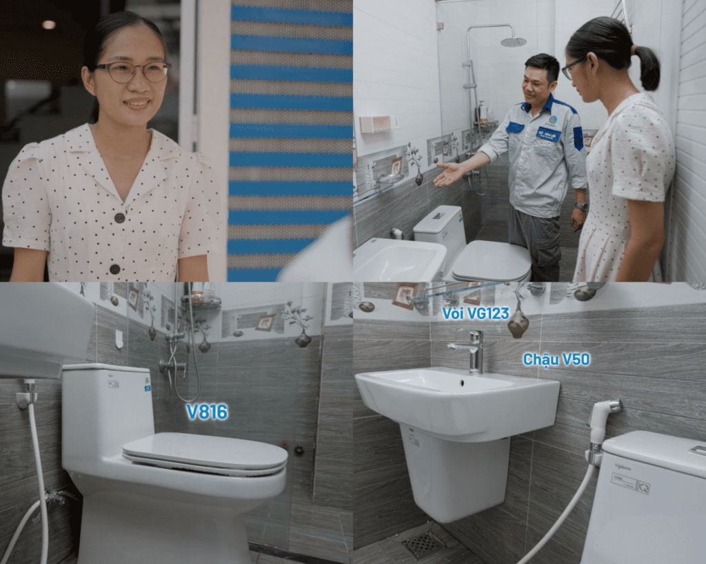 Viglacera chọn thay thế cho chị bộ sản phẩm mới: Bàn cầu một khối V816, chậu rửa V50 và vòi nước VG123. Chị Hải vui mừng chia sẻ: “Bộ sản phẩm này rất phù hợp với không gian phòng tắm nói riêng và không gian sống của gia đình nói chung.