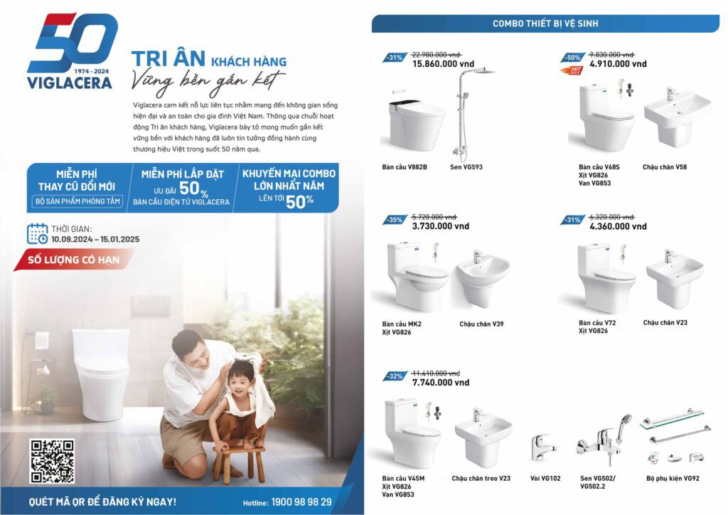Chào mừng Kỷ niệm 50 năm thành lập, thiết bị vệ sinh Viglacera dành tặng khách hàng chương trình Khuyến mãi lớn nhất dịp cuối năm với chiết khấu combo lên đến 50%, áp dụng cho nhiều dòng sản phẩm mới và tiêu biểu nhất của hãng. Chương trình diễn ra từ 15/11/2024 – 15/01/2025 tại hệ thống đại lý/cửa hàng trên toàn quốc.