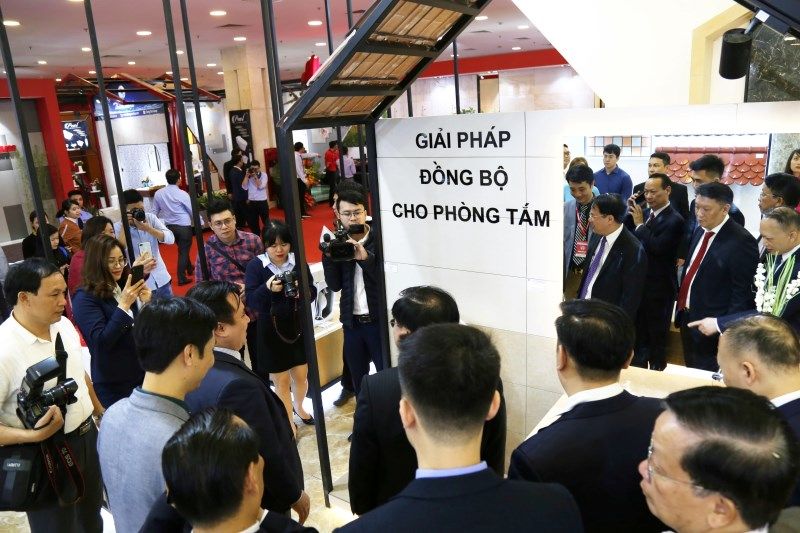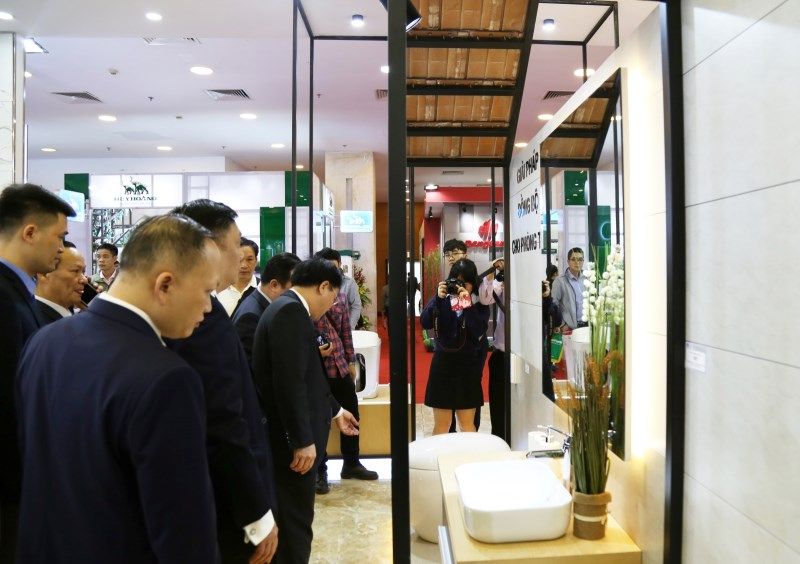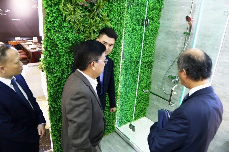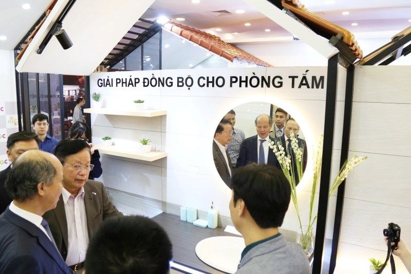 Thứ trưởng Bộ Xây dựng Nguyễn Văn Sinh trực tiếp tham quan các sản phẩm của Viglacera. Thứ trưởng đặc biệt quan tâm đến Bộ sản phẩm phòng vệ sinh đồng bộ.