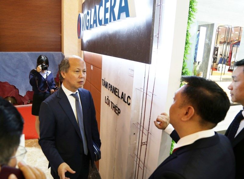 Ông Nguyễn Trần Nam – Chủ tịch Hiệp hội Bất động sản, Nguyên Thứ trưởng Bộ xây dựng đang thăm quan khu trưng bày tấm panel ALC