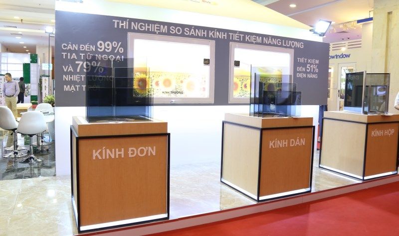 Khái niệm sử dụng Kính tiết kiệm năng lượng trong các công trình cao ốc cao cấp đã được người tiêu dùng dần nhận biết. Với các tính năng ưu việt và những so sánh trực quan tại gian hàng đã giúp khách thăm quan được trải nghiệm thực tế về kính Tiết kiệm năng lượng Viglacera. Sản phẩm được sản xuất trên dây chuyền công nghệ Xanh hiện đại từ CHLB Đức, có tác dụng ngăn đến 99% tia tử ngoại, cản đến 79% nhiệt lượng mặt trời và tiết kiệm đến 51% điện năng.
