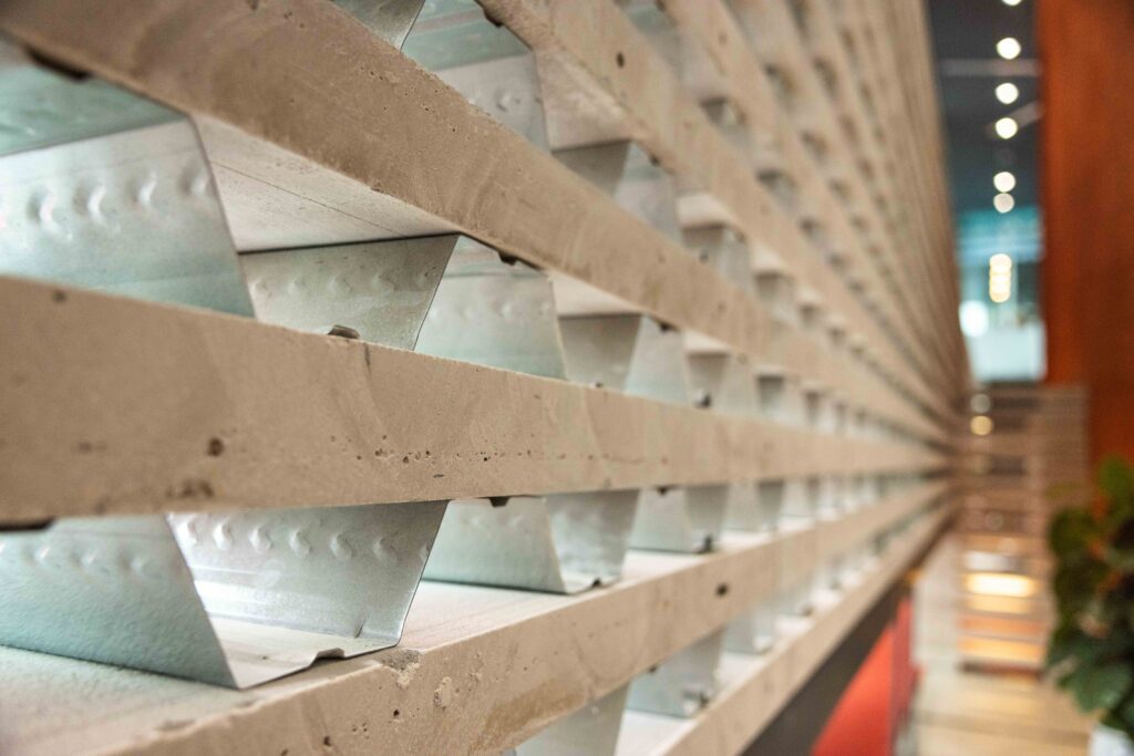 Gạch chữ U chống cháy được cách điệu, kết hợp cùng kính cường lực tạo thành một sản phẩm nội thất độc đáo trong Pavilion